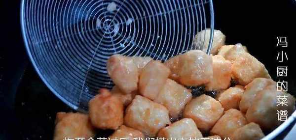 9.鍋中倒油,油溫大概7成熱左右,下入豆腐炸。剛下入的豆腐輕微晃動鍋底,防止粘鍋。炸制金黃以後撈出備用。
