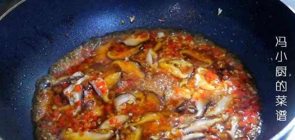 11.料頭炒出香味以後加入香菇,倒入調好的料汁,再加少量清水,翻拌至水開。