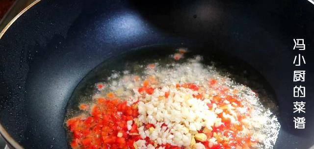 10.鍋留底油,下入準備好的薑末,蒜末,紅椒丁,炒出香味。