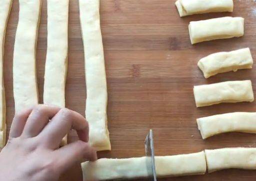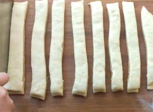 將已經搟好的糖油皮置於兩塊面皮之間,然後將其切割成寬度為2厘米的長條。