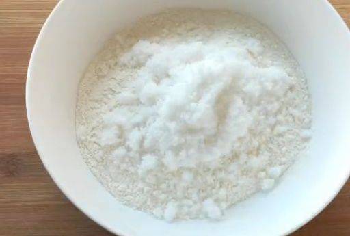 再取一隻幹凈的大碗,將200克面粉和80克白糖傾入其中,隨後用手將它們抓勻。