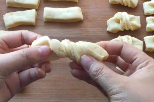 完成所有步驟後,使用保鮮膜進行覆蓋,進行兩次醒發,持續時間為10分鐘。醒發完畢後將面團分割成小方塊。面皮比較脆嫩。