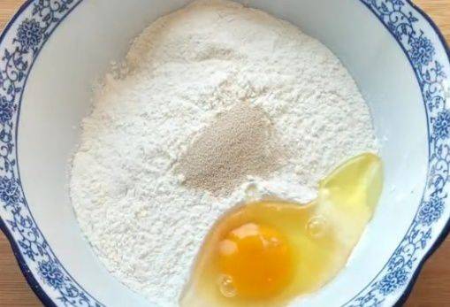 取一隻幹凈的大碗,將200克的面粉和2克的酵母倒入其中,接著打入一個雞蛋。