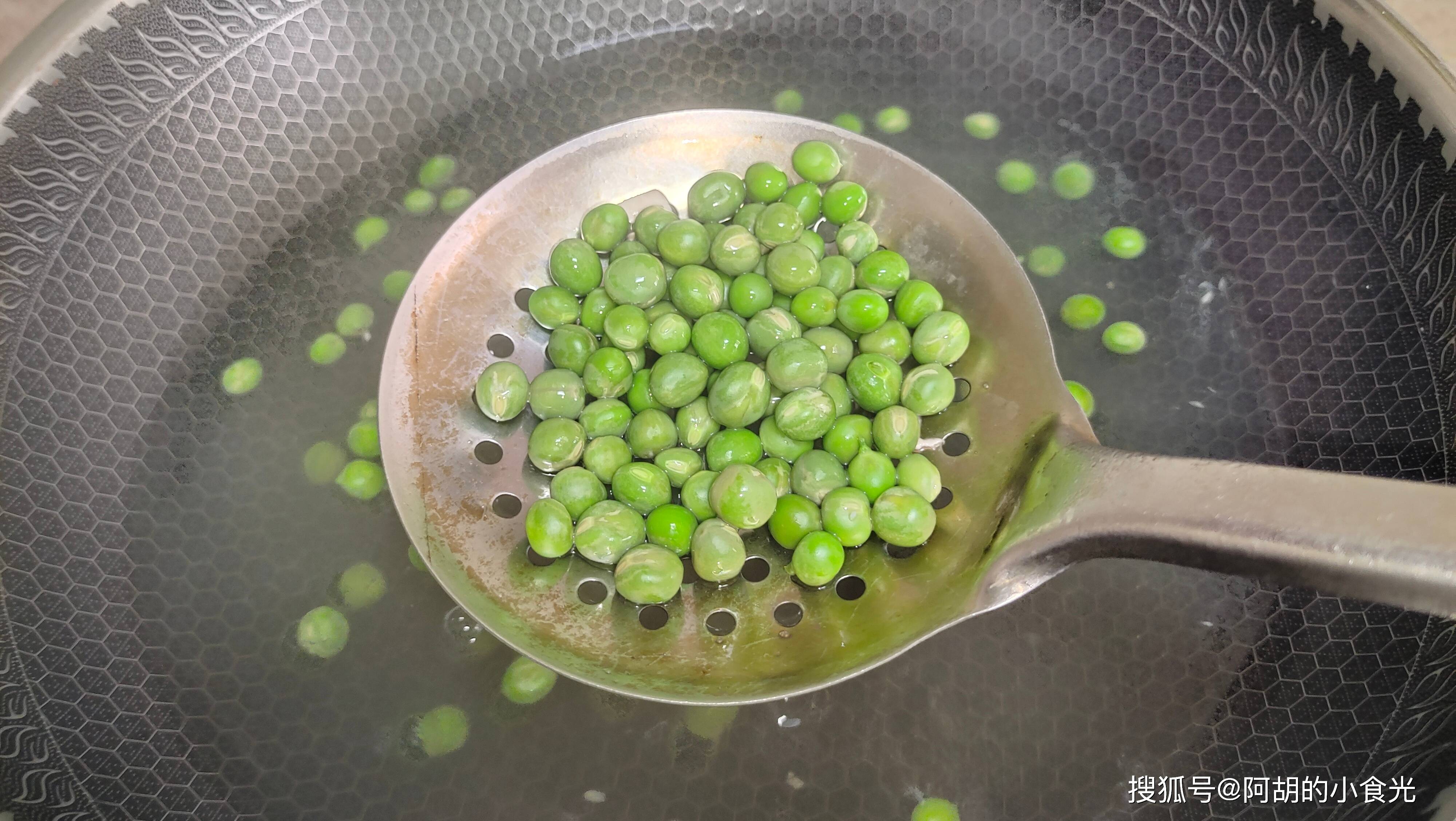 第四步:鍋裡燒開水,將口蘑片下鍋進行焯燙1分鐘,撈出來後放在一邊進行控水,接著再將豌豆粒下鍋煮熟後撈出備用。