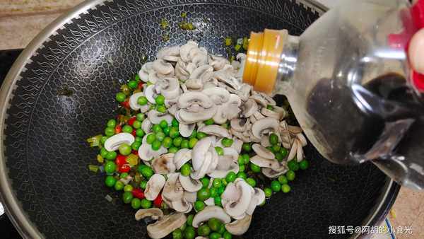 第六步:將焯燙後的口蘑片和豌豆粒全部下鍋,淋入一圈生抽,開大火進行翻炒2分鐘,使調料和各食材能夠融合,最後撒入少許的雞精提鮮,炒勻後既可以出鍋瞭。