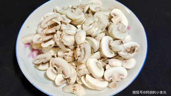 第一步:挑選大小均等的口蘑切片待用,註意挑選口蘑時不要選那種傘蓋打開的那種,一則口感和香味不佳,二則炒的時候會碎。