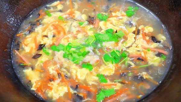 3、把鍋燒熱,加入少許底油,放入蔥花和薑末炒出香味,沿鍋邊倒入適量清水,倒入配菜,加入食鹽、胡椒粉、生抽、雞汁,大火燒開後打去浮沫,然後倒入面糊,繼續煮至湯汁沸騰淋入蛋液,撒上香菜即可。