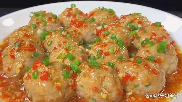 3、鍋裡油熱下入紅椒、蒜末炒香,加入蠔油,適量水,開鍋後調味,加入白糖、生抽和少量老抽,水淀粉勾芡,湯汁變濃稠就可以瞭。丸子蒸好以後,把料汁澆到上面。撒一點蔥花,蓮藕丸子就可以瞭。