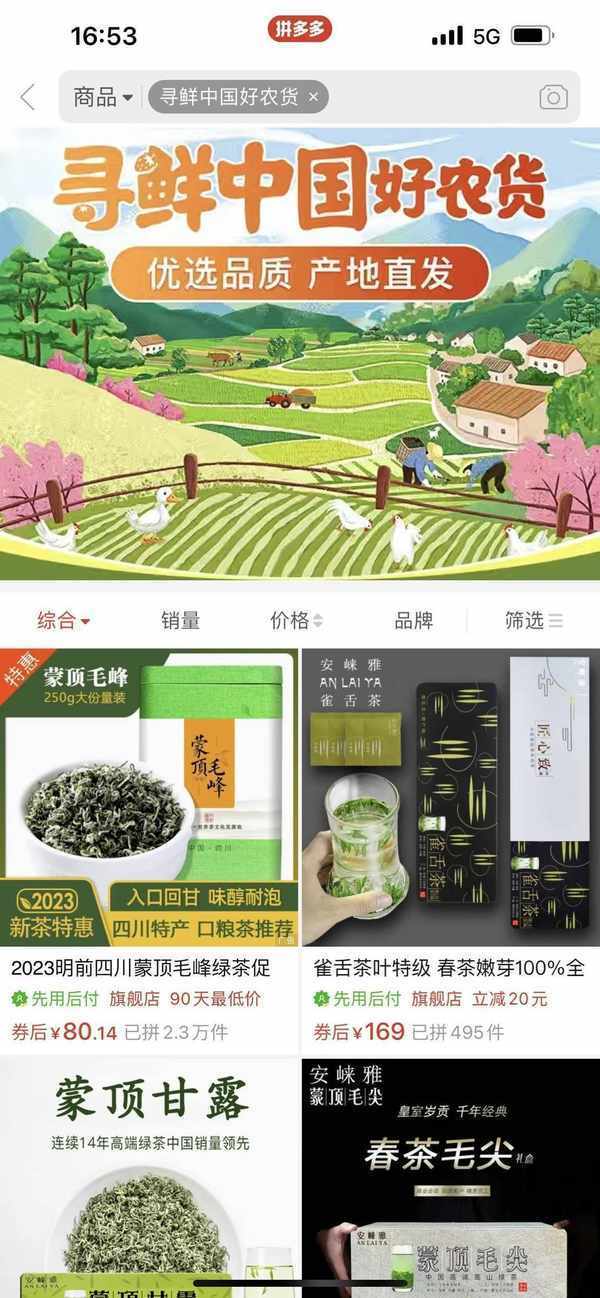 據任江介紹,目前公司線下更偏向於有機黑茶和綠茶的定制化加工生產,線上業務增長快,2022年在拼多多平臺的年銷售額達到400萬,這讓任江看到瞭新的銷售趨勢。今年,任江計劃著重運營拼多多店鋪並組建直播團隊,將重心逐漸往線上傾斜。他的蒙山茶,也成功入選拼多多的“尋鮮中國 多多好農貨”。
