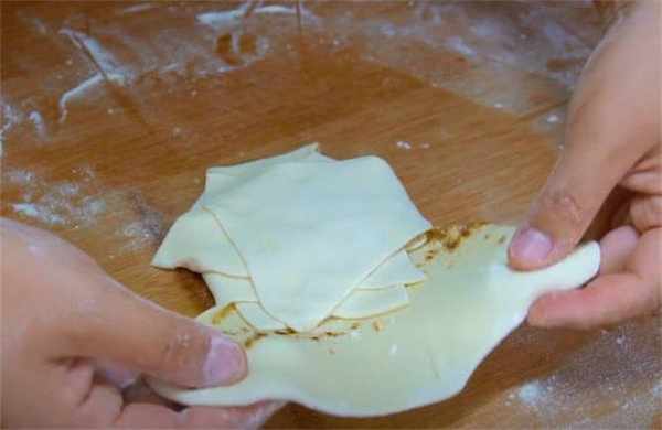 10.現在這個是第三種方法,搟成長方形的餅皮,然後均勻的分成幾等份,把這些小面片疊起來。