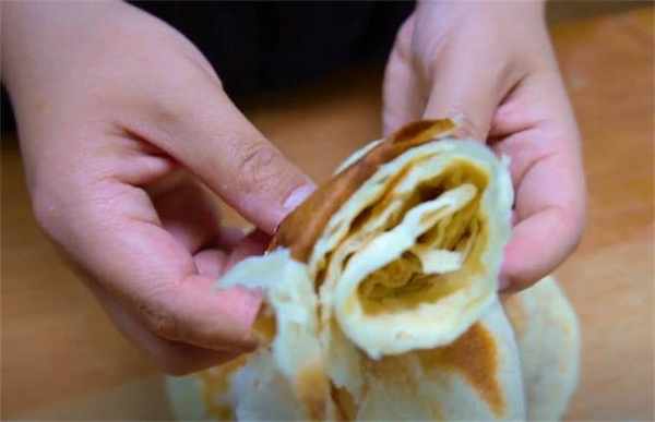 14.看這個餅非常的柔軟,而且面香味很重,撕起來很勁道,看一下這個層次也特別的豐富,喜歡烙餅的朋友可以試一試。