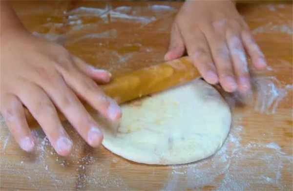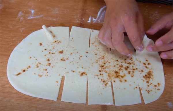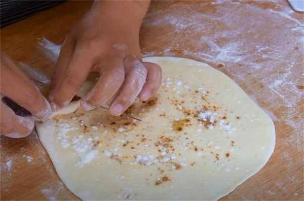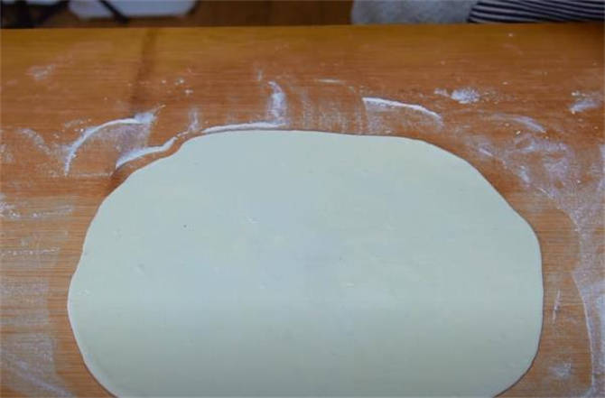 8.現在我們再來分享第二種方法,搟好餅皮之後在半徑處切一刀,然後順著這個折卷起來。