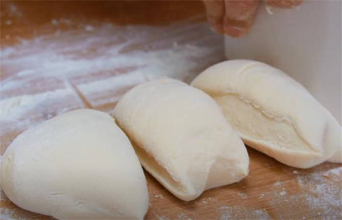 3.案板上撒一些幹粉,直接滾成長條,切四個面劑。