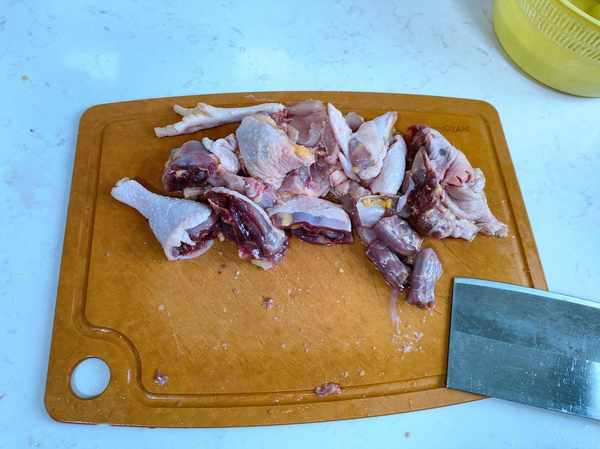 我傢裡人少,常常隻有我一個人,所以我把一隻老母雞分成兩半,這樣一餐就可以吃完,頓頓可以吃新鮮的。