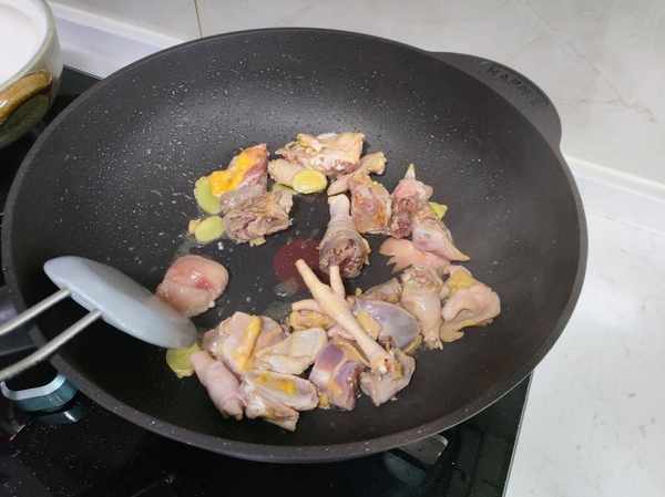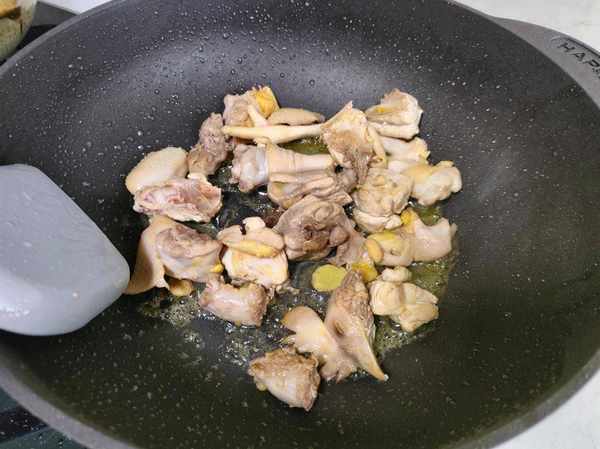 鍋裡加少許油,放入薑片和雞肉,翻炒。