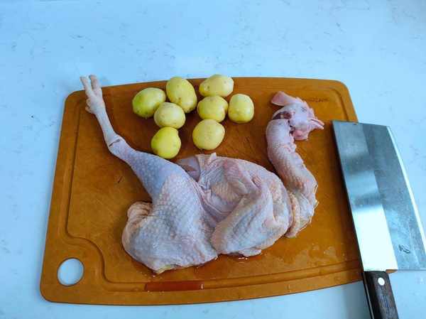 母雞收到是剖洗好的,自己簡單再清洗一下,同時剪掉趾甲和雞屁股,再撕掉一些皮下脂肪和淋巴結。土豆刮去外皮。