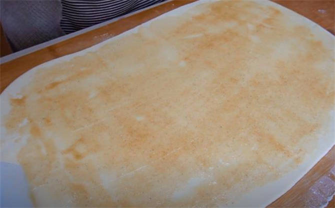 2.案板上多撒一些幹粉防粘,把面團按扁,搟成長方形的餅皮,表面刷一層油酥抹勻。