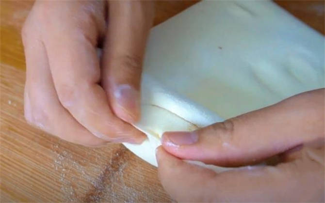 3.對半疊起來,把容易露酥的地方都捏緊。