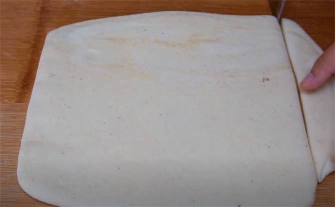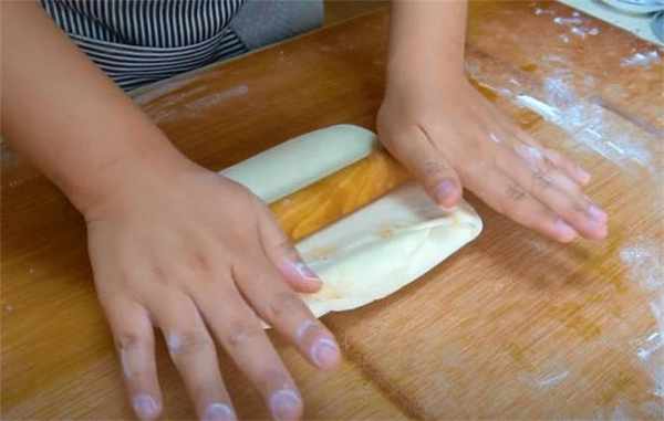 4.再搟成餅皮,搟好之後再對折,然後再搟開,反復這個步驟三次。