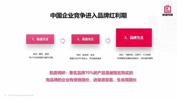 中國市場經濟經歷瞭從制造為王、渠道為王,一直到品牌為王的發展全鏈路。今天,品牌已經成為衡量企業價值的核心要素。凱度調研顯示,著名品牌70%的產品是被指名購買的,有品牌的企業有資格提價,進渠道更容易,生命周期更長,抗風險力更強。