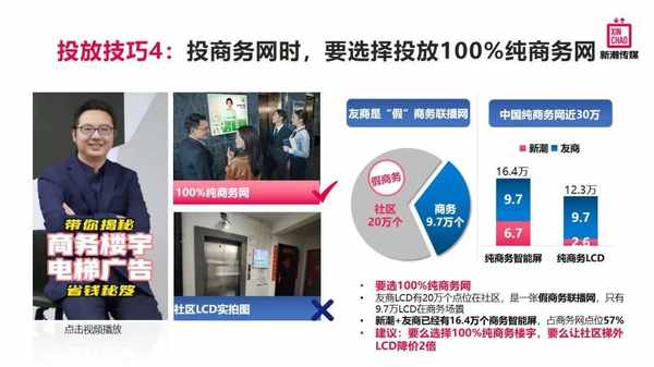 技巧四:投商務網時,要選擇投放100%純商務網。商務宴請是白酒品牌永遠繞不開的場景。如果要投商務場景,就要投100%的純寫字樓。而新潮和友商在商務智能屏數量已經達到16萬個,占據瞭商務網總點位的57%,為品牌提供瞭足夠引爆的資源。
