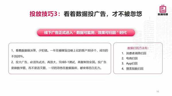 技巧三:看著數據投廣告,才不被忽悠。一年在梯媒盲目砸上億的客戶30多個,成功的不到20%。所以建議廣告投放要理性,先挑幾個城市試投,找到最優投放方案後再向全國復制,我們用這種方法讓客戶在廣告投放的時候少犯錯,大大降低瞭投放風險。