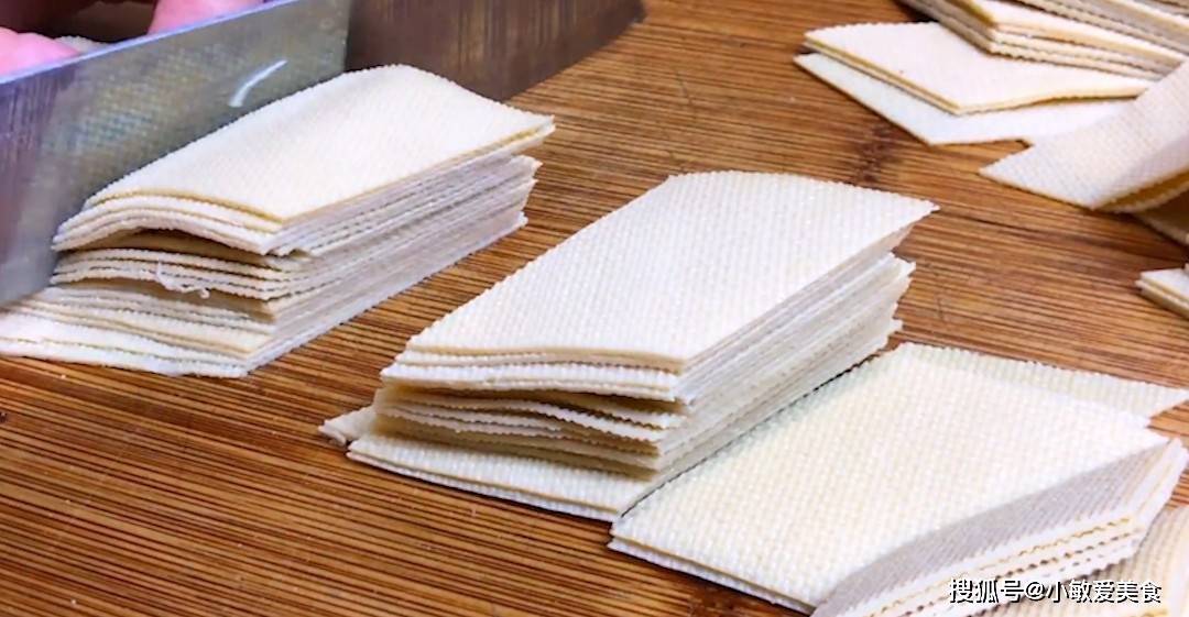 1、首先準備兩張幹豆腐皮,平鋪在菜板上面,改刀切成菱形片,切完裝入盤中備用。