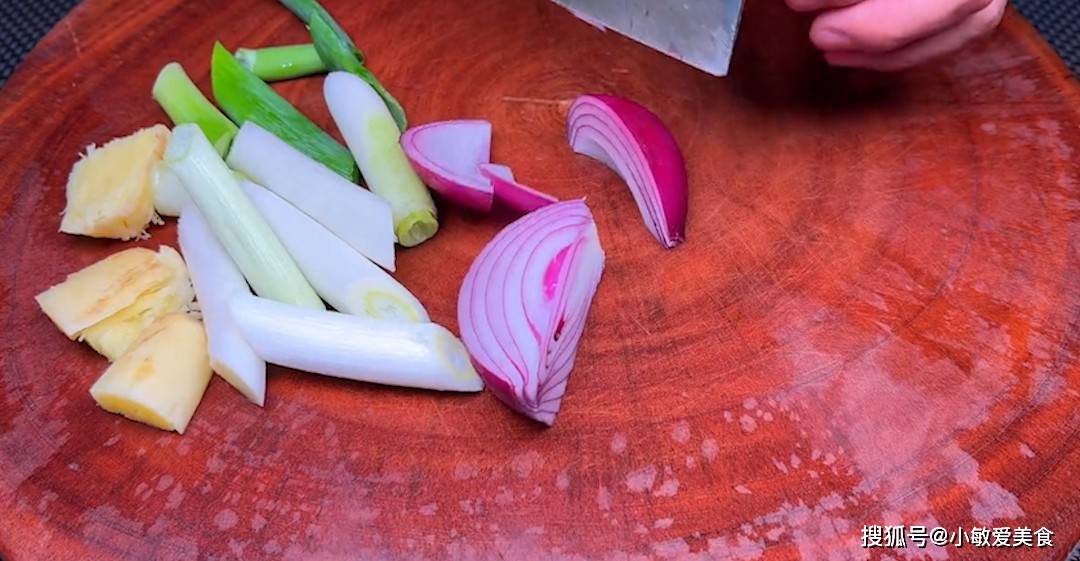 3、準備一塊生薑拍扁,一根大蔥切成長段,一小塊洋蔥切成小片。