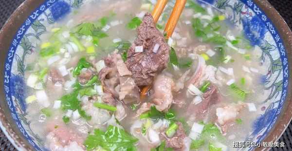 7、羊肉放涼後切成均勻的小塊,放入羊湯中,加點鹽和胡椒粉調味,攪勻煮開就可以盛入碗中瞭,再放上切好的蔥花、香菜,攪勻就可以開吃瞭。