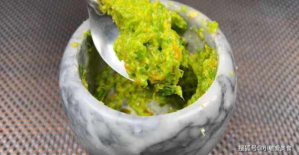 6、調一個好吃的蘸料,蒜臼中放入掰段的辣椒,再加一點食鹽,先搗碎,再放一把韭菜花,再次搗碎備用。