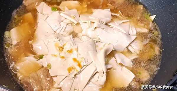 6、鍋中倒入少許的食用油,油熱以後放入五花肉煸炒出油脂,再放入薑末、蔥花,大火翻炒出香味,沿著鍋邊淋入一勺生抽,再加入一碗清水。鍋裡面的湯汁煮開之後,倒入豆皮,加入食鹽,一勺雞精,一勺白糖,用筷子攪拌一下,讓調料充分的融合在豆皮裡面。