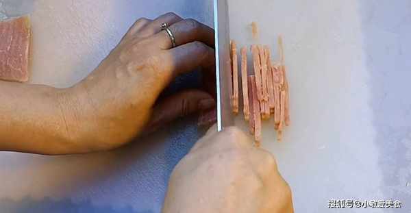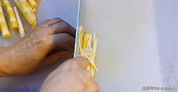2、再把配菜切一下,把竹筍切成細絲,再切一點火腿絲。