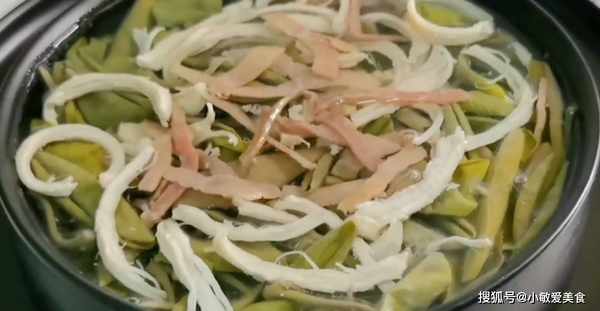 2、撈出所有食材,保留湯汁,將雞胸肉撕成細絲,火腿也切成細絲,將火腿絲和雞肉絲一起放入雞湯中,小火燉煮五分鐘左右,放入蓴菜,再燒開就可以熄火瞭。火腿是咸的,不用再放鹽,雞絲蓴菜羹就做好瞭。純菜爽滑,雞絲軟嫩,湯清味鮮,特別好吃。