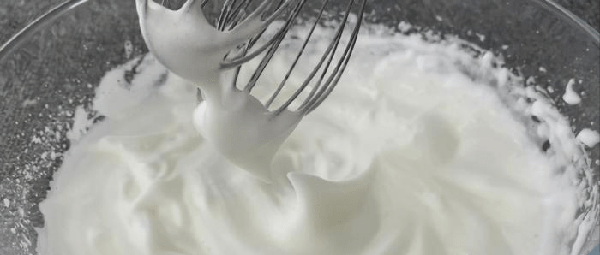 2.蛋清的碗中我們滴幾滴白醋去腥,再加入10克的白糖然後用電動打蛋器中速打發,打發至提起打蛋器出現彎鉤的狀態就可以瞭。