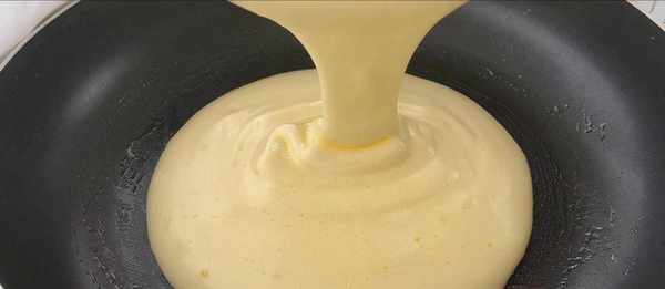 4.接下來我們再準備一個平底鍋刷上一層薄薄的食用油,然後把蛋黃糊倒入鍋裡面。