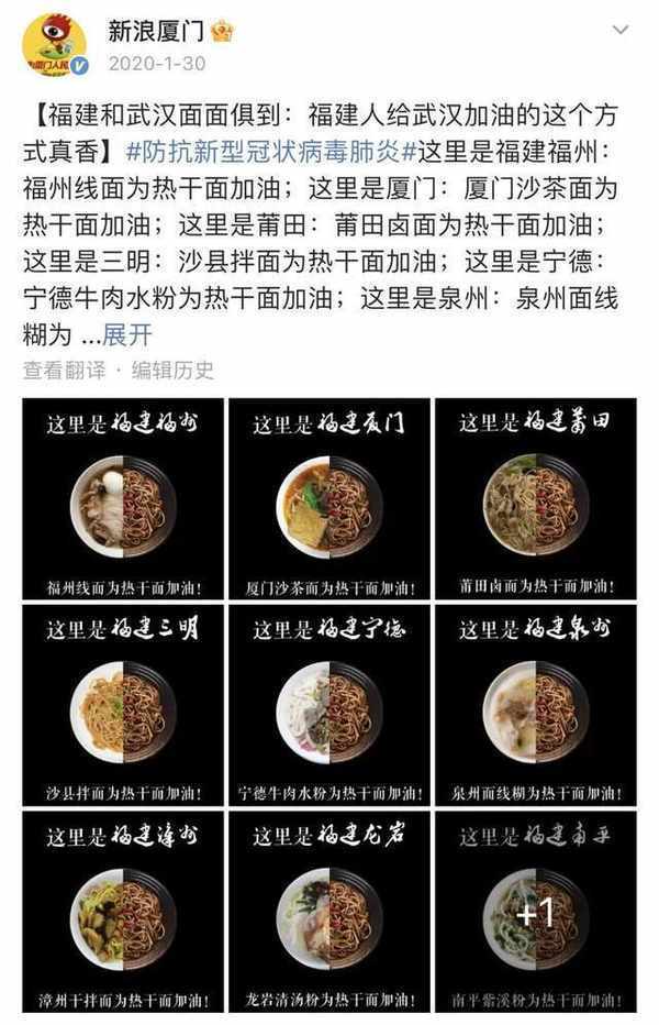 2020年,全國各地小吃為“武漢熱幹面”加油,福建就派出瞭不同地市的各種面食 | 來源:微博@新浪廈門