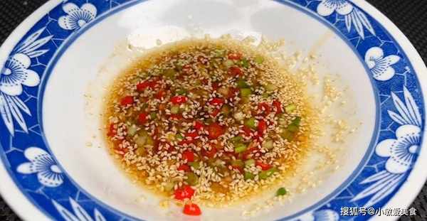2、準備一把小蔥,切成蔥花,準備幾瓣大蒜,拍扁,然後剁成蒜末,三個小米椒切成小米椒圈。全部切好,放入碗中,加一勺白芝麻,澆上熱油,炸出香味,然後加一勺鹽、兩勺生抽、兩勺陳醋,攪拌均勻備用。
