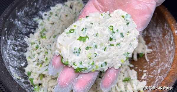 4、加入一勺鹽,一勺五香粉,攪拌均勻,給蘿卜絲入味,再準備兩顆香菜和小蔥切碎,放入蘿卜絲碗中。再次攪拌均勻,然後加一勺玉米淀粉,一勺低筋面粉,再次攪拌均勻,然後取一團用手抓緊壓成橢圓形的小餅,全部做好,直接放入蒸鍋裡面。
