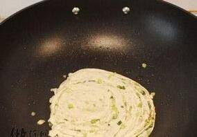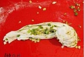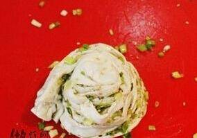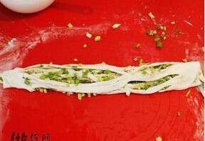 7、將鍋裡刷一層油,將卷好的面團再搟開,中小火煎。