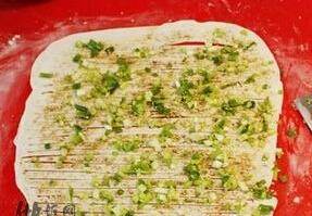 2、將面團分成兩份,取1份,搟開,搟薄一些比較好,刷一層芝麻油,均勻地撒上鹽、花椒粉、五香粉、小蔥和芝麻。