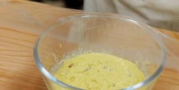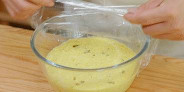 揭掉保鮮膜,把玉米糊攪拌均勻,攪出大氣泡。