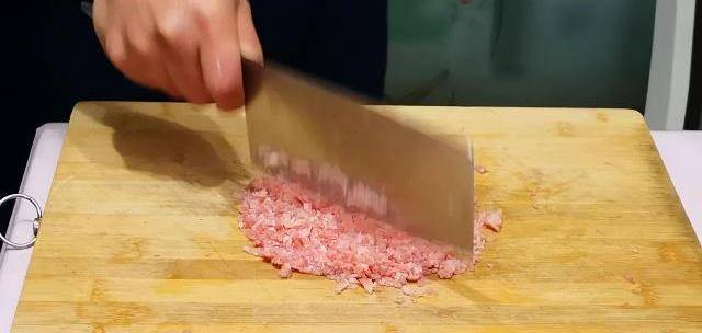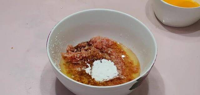 第一步:肉剁肉餡,自己剁餡既幹凈衛生又好吃;放入2g鹽,適量胡椒粉、料酒、生抽、兩個蛋清(蛋黃備用)、生粉攪拌均勻,醃制10分鐘。