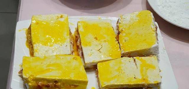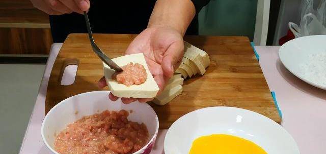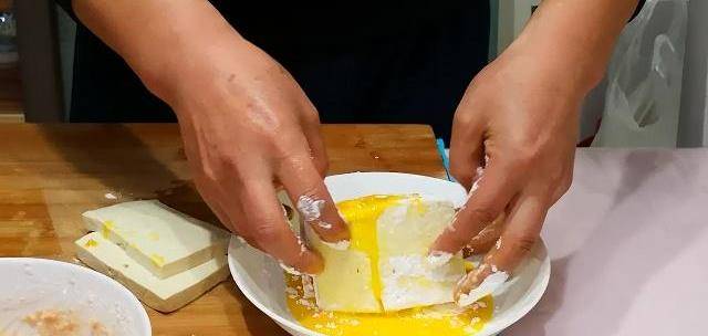 第二步:豆腐切成薄片,拿一塊豆腐塊,中間夾肉再蓋上一塊豆腐,四周沾一點生粉,再在蛋黃液裡滾一下