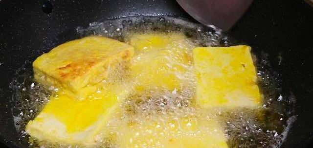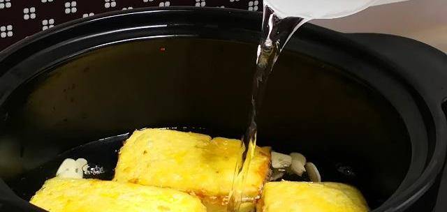 第四步:油溫六成熱,下鍋炸豆腐,炸至兩面金黃,撈出放入砂鍋內