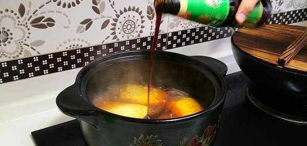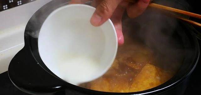 第六步:調味道:老抽調色,生抽增鮮,耗油提味,加入鹽中火燉8分鐘,然後淋水淀粉,關火出鍋。