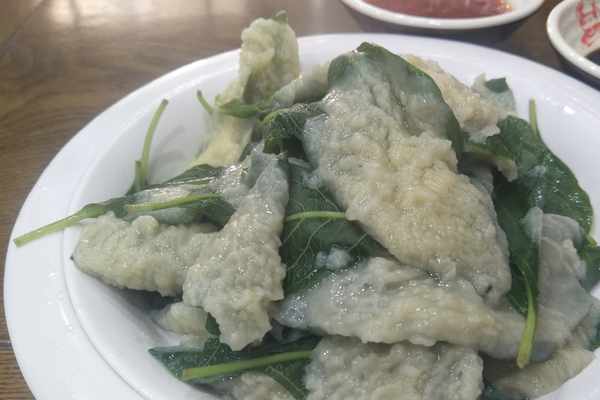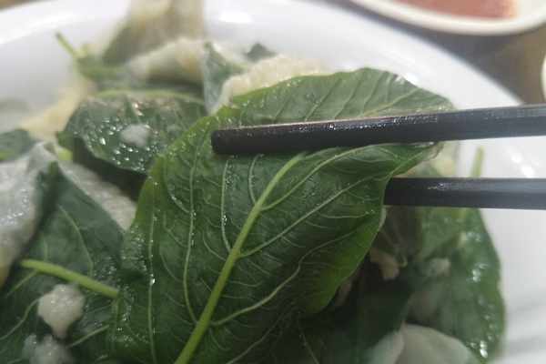 這道小吃,用本地草本植物玉穀葉(野莧菜)作為主要原料,沾麵糊之後在鍋裏煮幾分鐘,讓麵糊充分熟化並掛在葉子上,撈出鍋就可以蘸料吃了。