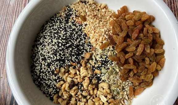 第五步:提前準備好的熟土豆、核桃仁、芝麻、瓜子仁碾碎粒,葡萄乾,再放入100克炒熟的麵粉攪勻。