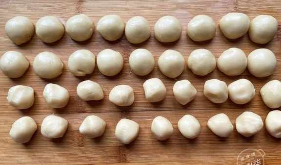 第八步:把醒好的水油皮面搓成長條分成大小相等的劑子,每個劑子大約20克,再把油面也分成同等分的劑子,大約16克左右。