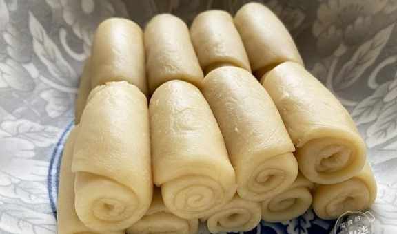 第十步:全部包好後,取其中的一個球擀成牛舌狀再從一頭卷成圓柱。