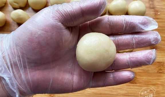 第九步:將水油皮面劑子用手掌按成圓皮,把油面包裹在裡面,搓成光滑的圓球,像這樣就可以了。